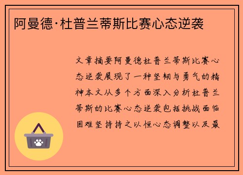 文章摘要:阿曼德·杜普兰蒂斯比赛心态逆袭,展现了一种坚韧与勇气的精神。本文从多个方面深入分析杜普兰蒂斯的比赛心态逆袭,包括挑战面临困难、坚持持之以恒、心态调整以及最终的胜利之路。通过详细的阐述,揭示了...