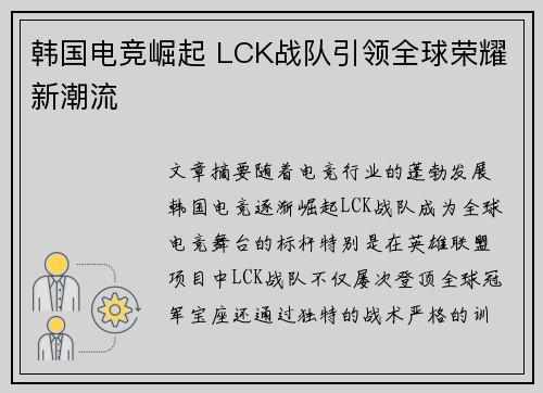 文章摘要:随着电竞行业的蓬勃发展,韩国电竞逐渐崛起,LCK战队成为全球电竞舞台的标杆。特别是在《英雄联盟》项目中,LCK战队不仅屡次登顶全球冠军宝座,还通过独特的战术、严格的训练体系和高度的团队协作精...