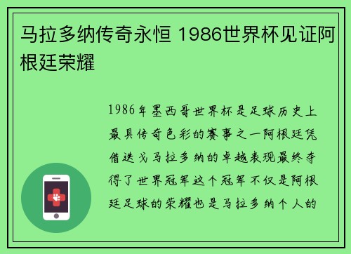 1986年墨西哥世界杯,是足球历史上最具传奇色彩的赛事之一。阿根廷凭借迭戈·马拉多纳的卓越表现,最终夺得了世界冠军,这个冠军不仅是阿根廷足球的荣耀,也是马拉多纳个人的巅峰之作。马拉多纳在这届世界杯上展...