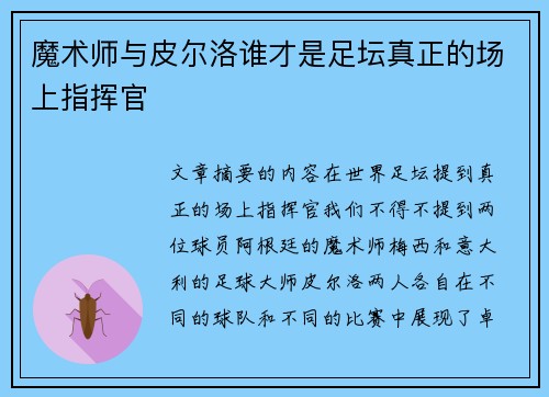 文章摘要的内容在世界足坛,提到真正的场上指挥官,我们不得不提到两位球员:阿根廷的“魔术师”梅西和意大利的足球大师皮尔洛。两人各自在不同的球队和不同的比赛中展现了卓越的领导力和技术才华,他们不仅仅是进攻...