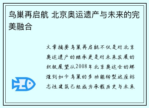 文章摘要:鸟巢,再启航,不仅是对北京奥运遗产的继承,更是对未来发展的积极展望。从2008年北京奥运会的辉煌到如今鸟巢的多功能转型,这座标志性建筑已经成为承载历史与未来、传统与创新的综合体。本文从鸟巢的...