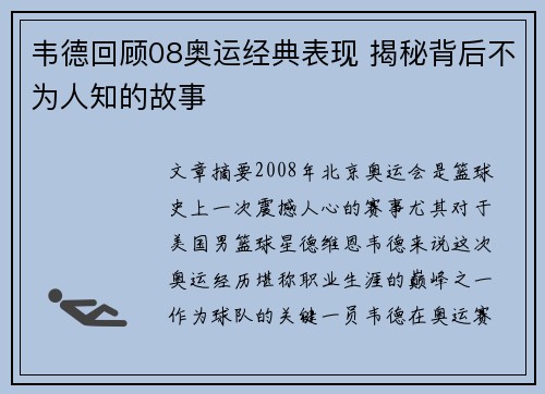 文章摘要:2008年北京奥运会是篮球史上一次震撼人心的赛事,尤其对于美国男篮球星德维恩·韦德来说,这次奥运经历堪称职业生涯的巅峰之一。作为球队的关键一员,韦德在奥运赛场上发挥了至关重要的作用,不仅在比...